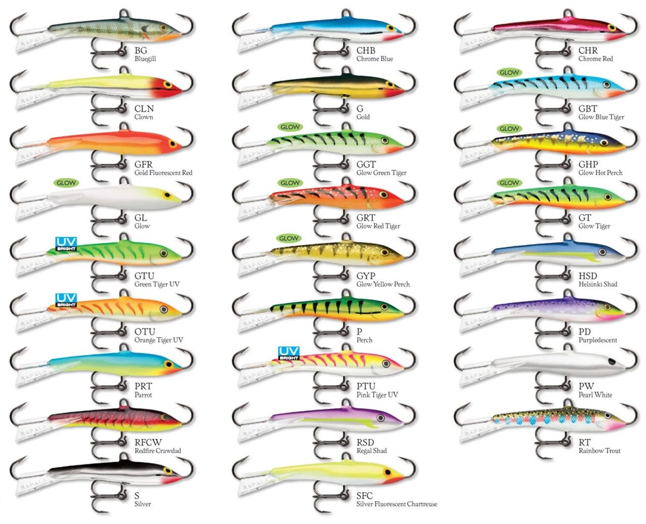 | Color | Bluegill, Glow, Glow Red Tiger, Glow Tiger, Green Tiger UV, Glow Yellow Perch, Helsinki Shad, Orange Tiger UV, Perch, Purpledescent, Parrot, Chrome Blue, Pink Tiger UV, Pearl White, Redfire Crawdad, Regal Shad, Rainbow Trout, Silver, Silver Fluorescent Chartreuse, Chrome Red, Clown, Gold, Glow Blue Tiger, Gold Fluorescent Red, Glow Green Tiger, Glow Hot Perch |